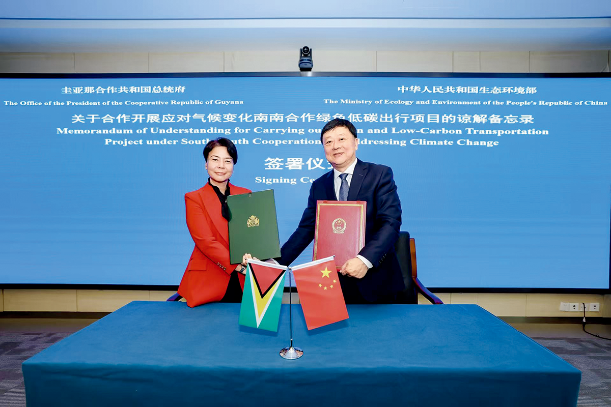 10月10日,生态环境部副部长李高与圭亚那驻华大使周雅欣在北京签署《中华人民共和国生态环境部与圭亚那合作共和国总理府关于合作开展应对气候变化南南合作绿色低碳出行项目的谅解备忘录》。